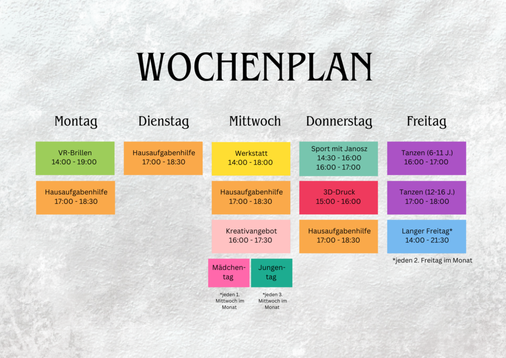 Das Jugendzentrum Tostedt (JuzT) bietet von 14:00-19:00 Uhr die verschiedensten Freizeitmöglichkeiten für Kinder und Jugendliche im Alter von 6-21 Jahren an. Dabei geht das Angebot von Tischkicker, Billard, Dart und Gesellschaftsspielen über Hausaufgabenhilfe und der Fahrradwerkstatt hin zur Tanzgruppe und der Mädchengruppe. Unser Haus ist stets von mindestens einer pädagogischen Fachkraft besetzt, die immer ein offenes Ohr hat. Der Besuch im JuzT ist grundsätzlich kostenlos, für manche Angebote wie zum Beispiel Kreativangebote wird