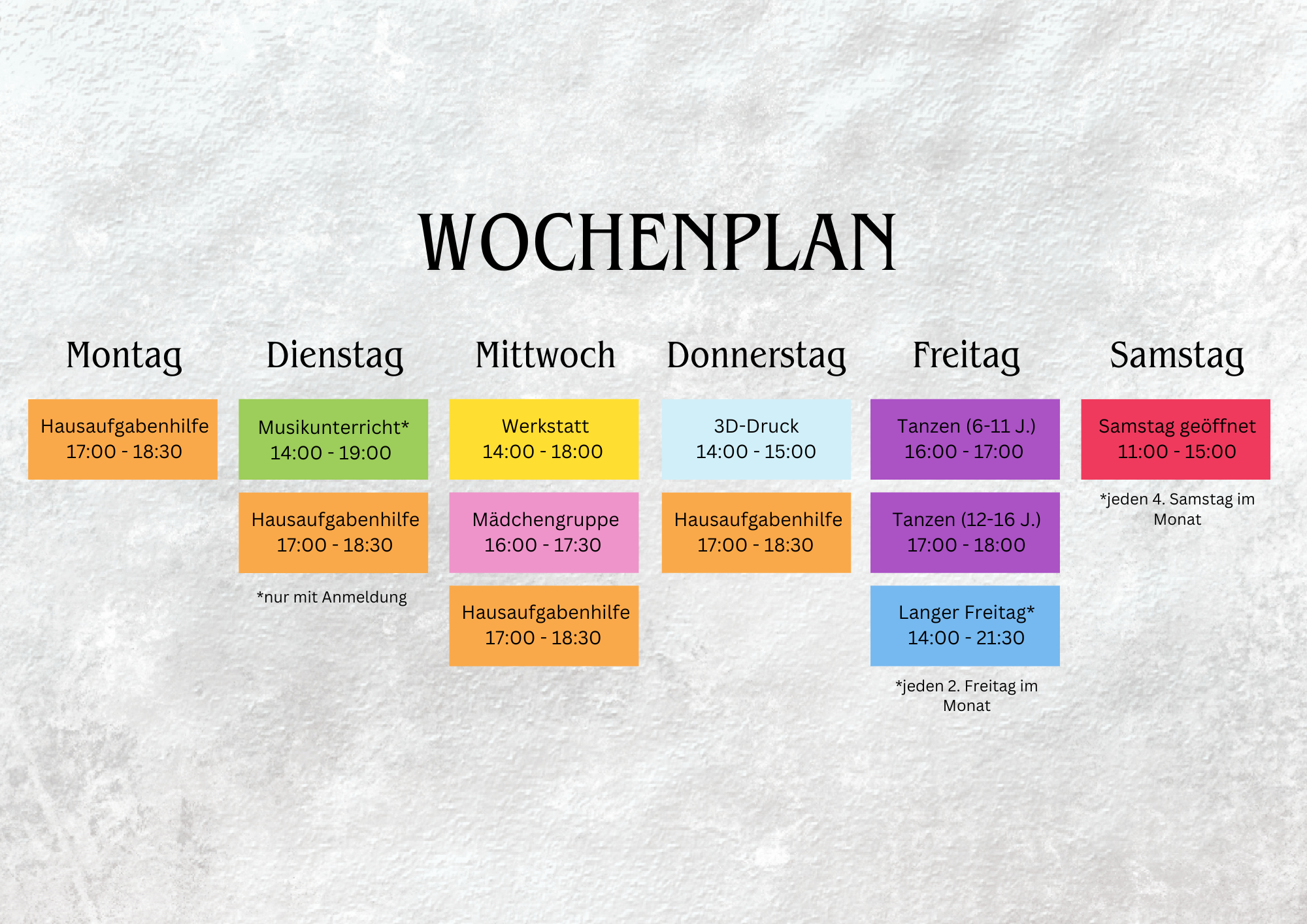 zwischen 6 und 11 Jahren statt und die andere Gruppe beginnt im Anschluss um 17:00 Uhr für Jugendliche im Alter von 12 bis 17 Jahren. In dieser Zeit liegt der Fokus auf Spaß, während gleichzeitig Selbstvertrauen, Teamarbeit und die Freude an Bewegung und Tanzen gefördert werden.